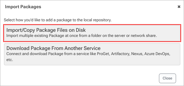 ProGet can import packages from other ProGet instances, Azure Artifacts, JFrog Artifactory, or Sonatype Nexus. The package types that can be imported will depend on the source server type that you are importing your package from.