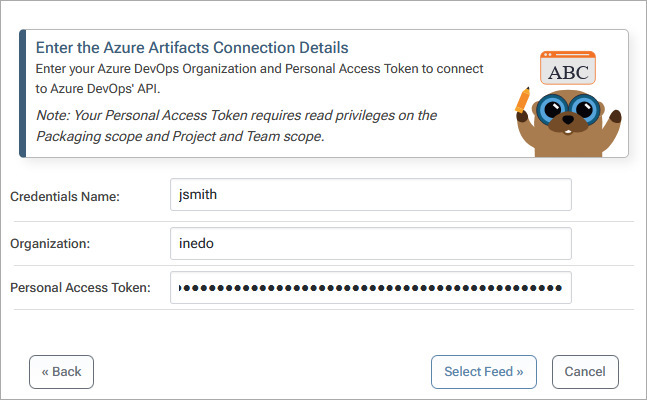 To create a connection to an Azure Artifacts server you will need your Azure DevOps Name, Organization and Personal Access Token. Note that your Personal Access Token requires read privileges on the Packaging scope and Project and Team scope.