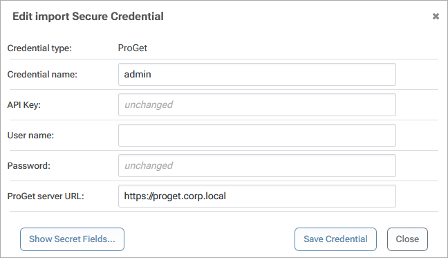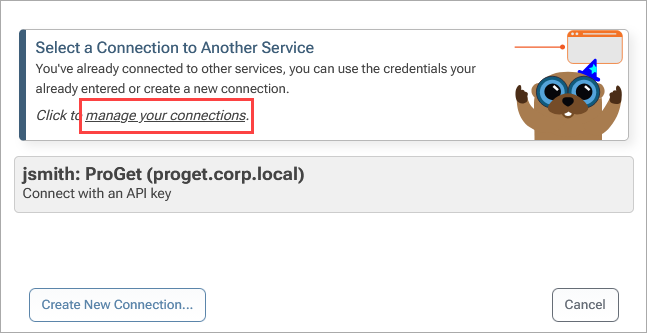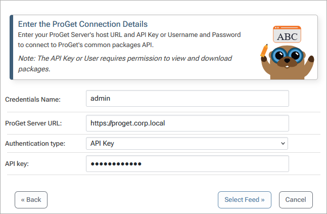 To create a connection to another ProGet feed you will need the ProGet Server URL and an API Key or User credentials to authenticate to the feed. Note that The API Key or User requires permission to view and download packages.
